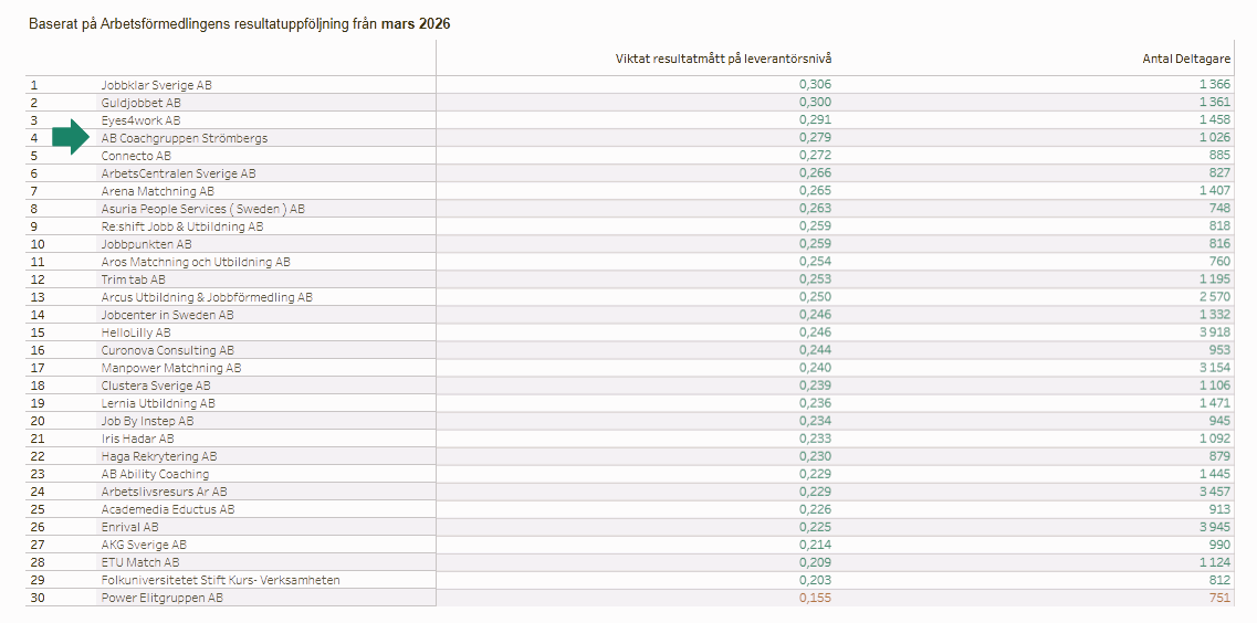 Nya siffror från Arbetsförmedlingen (april 2026) bekräftar det vi själva ser i vår vardag: Coachgruppen fortsätter att prestera i det absoluta toppskiktet av leverantörer inom Rusta och matcha. Av cirka 230 aktörer i landet placerar vi oss återigen mellan plats 1 och 5.